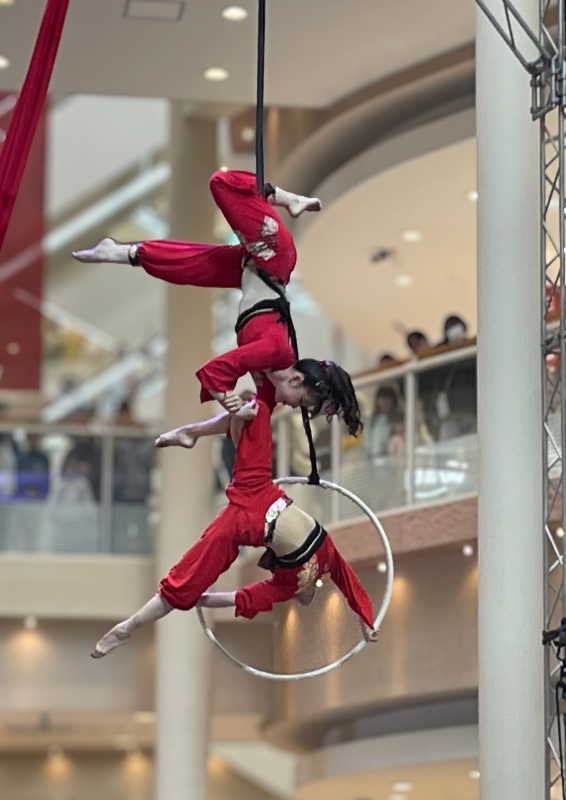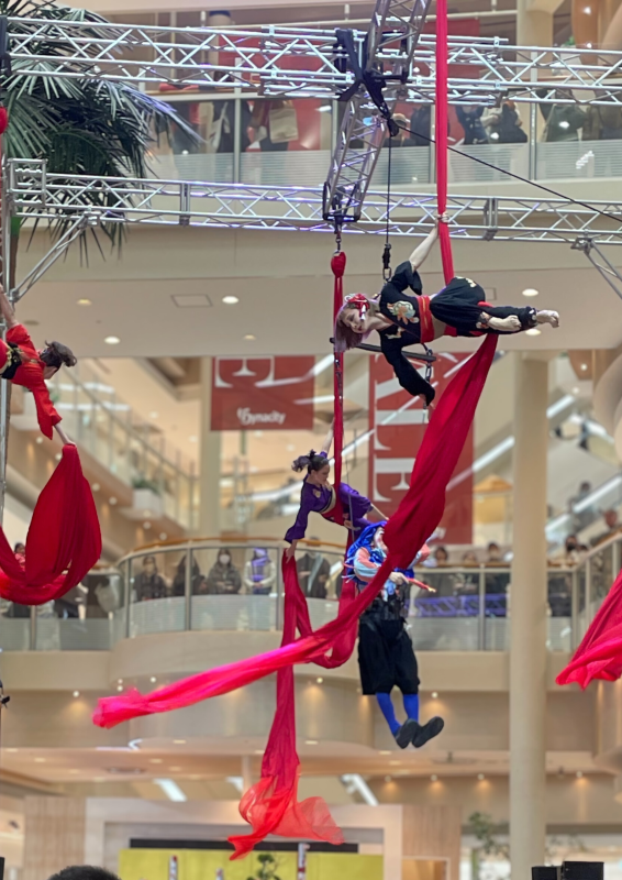 エアリアルとは、天井からつるした「特殊な布(ティシュー)」や「専用の器具(リング)」を使い、見上げるほどの高さのある空間でおこなうパフォーマンスのことです。世界的に有名なサーカス集団「シルク・ドゥ・ソレイユ」でも演じられているのでご存じの方も多いと思います。かつて、空中パフォーマンスといえば、ラスベガスやヨーロッパなど外国の限られた場所でしか見ることができませんでした。ダイナシティでは10年以上も前から、いち早くこのエアリアルを取り入れたオリジナルのステージを開催し、目の前で演じられる迫力満点のパフォーマンスを来館するお客様に楽しんでいただいております。2026年は、専用のロープを使用した迫力あるコードアクトを始めて披露させていただきます。ダイナシティのお正月の風物詩「エアリアル空中サーカス」を是非お楽しみください!