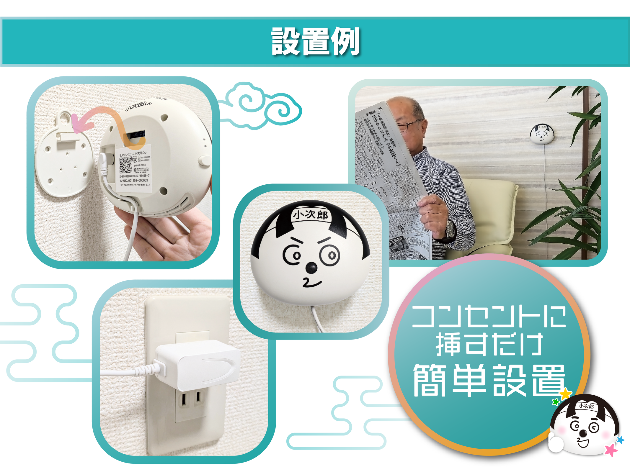 小次郎くんが一人暮らしの高齢者を優しく見守り、Wi-Fi環境が無くても異変があればLINEやメールでご家族や関係者にアラート通知でお知らせします。