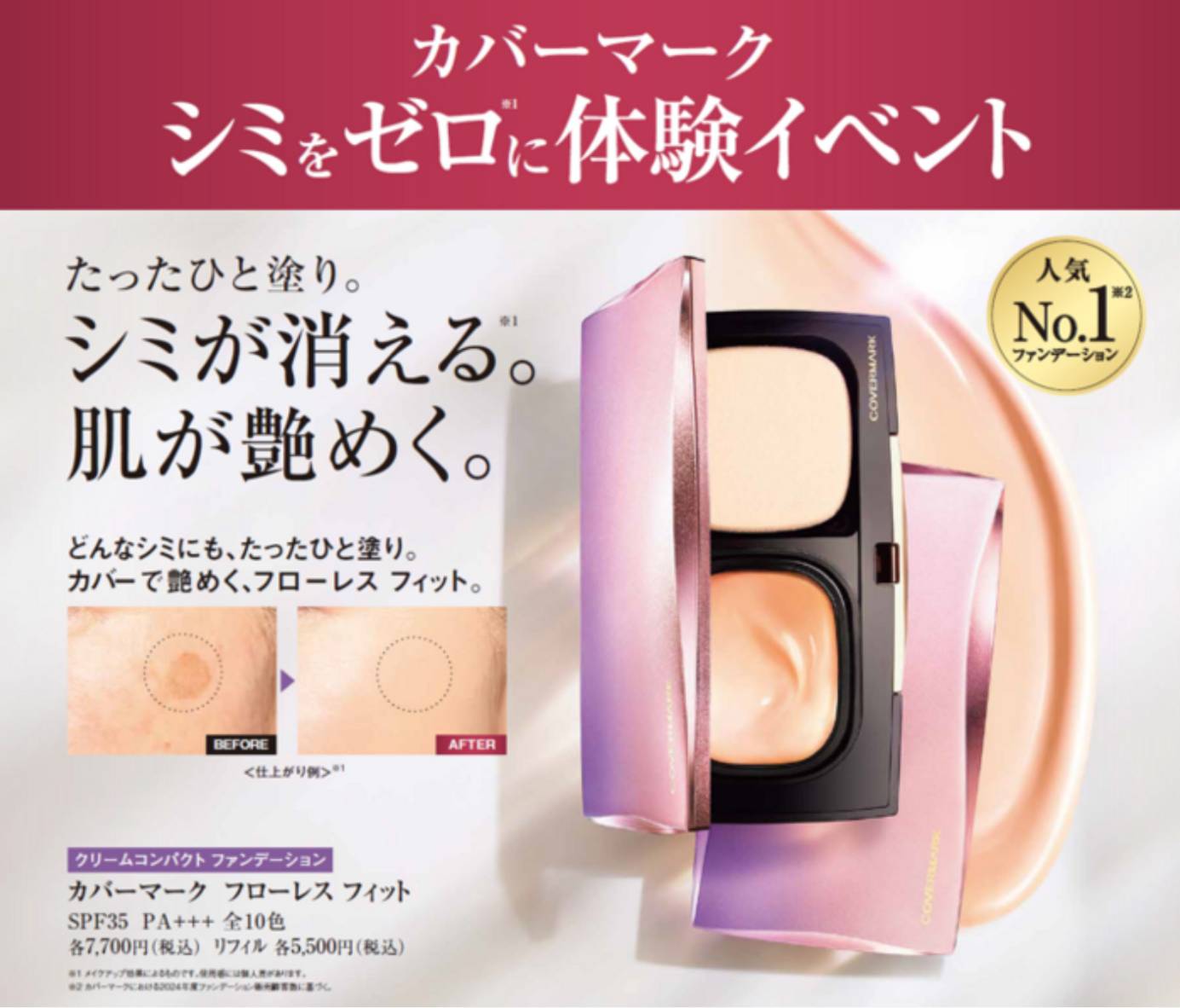 ひと塗りでシミが消える!(メイクアップ効果によるもの)人気のファンデーション「フローレスフィット」を体験いただけるイベントを開催いたします。