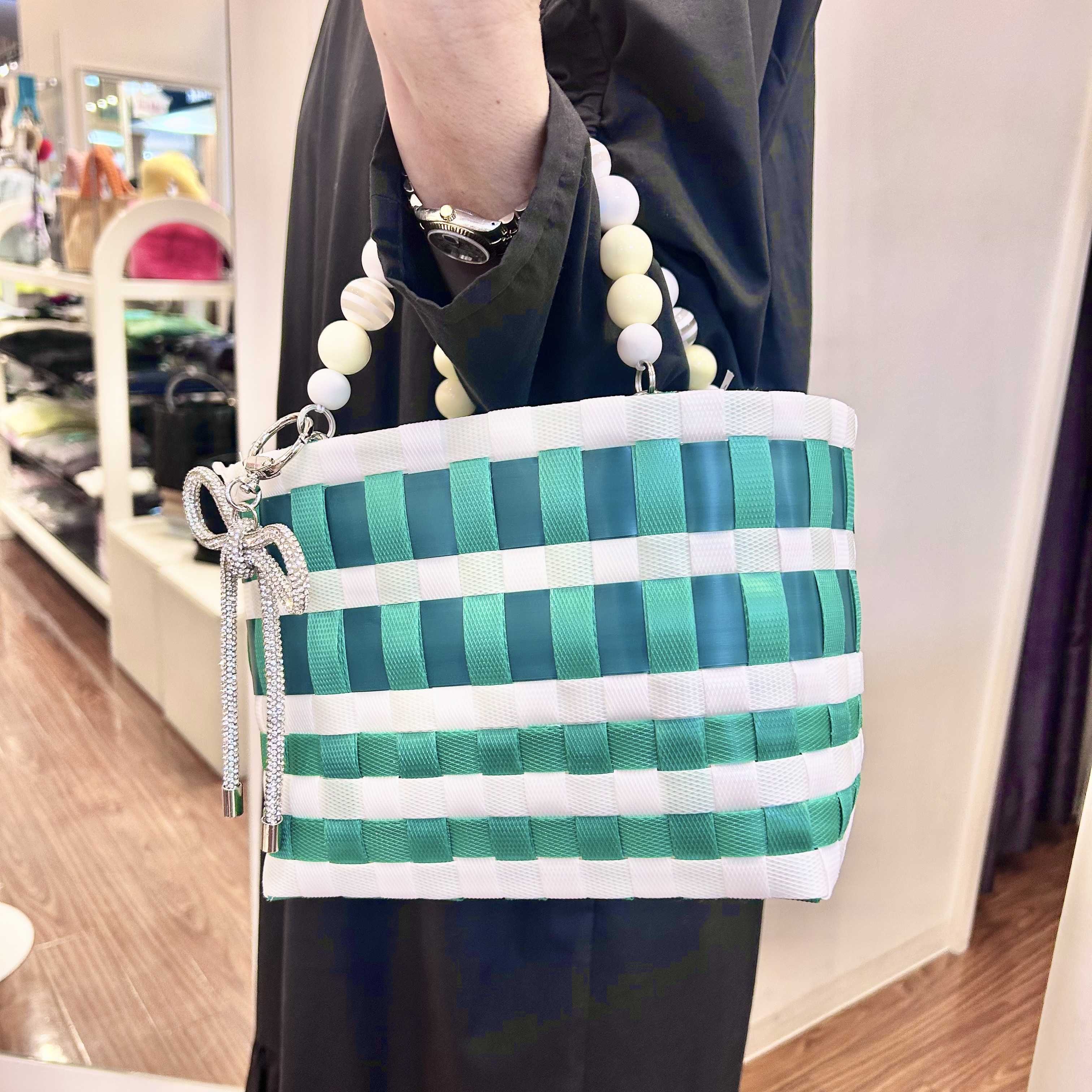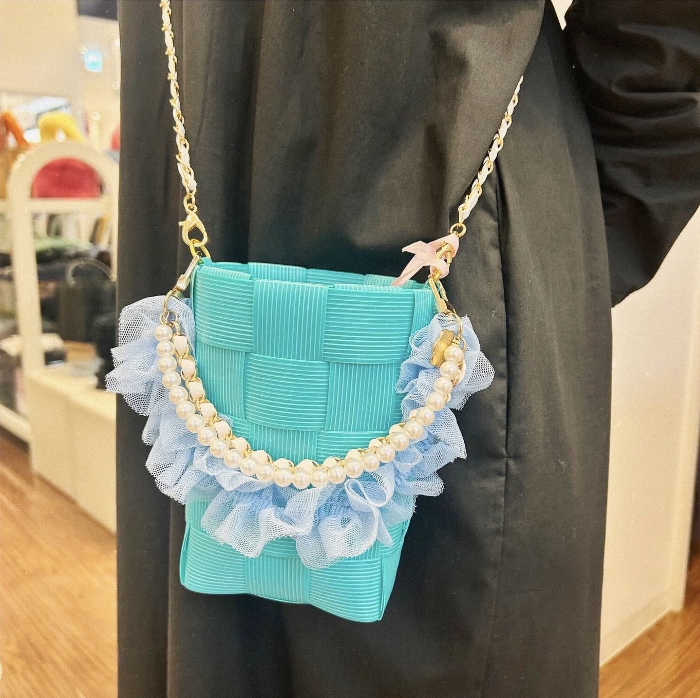 こちらのバッグは、黒やグリーン、ブルー、レッドなどのカラーバリエーションで、持ち手がパールやビーズになっていたり、リボンやフリルが装飾されたりしています。
