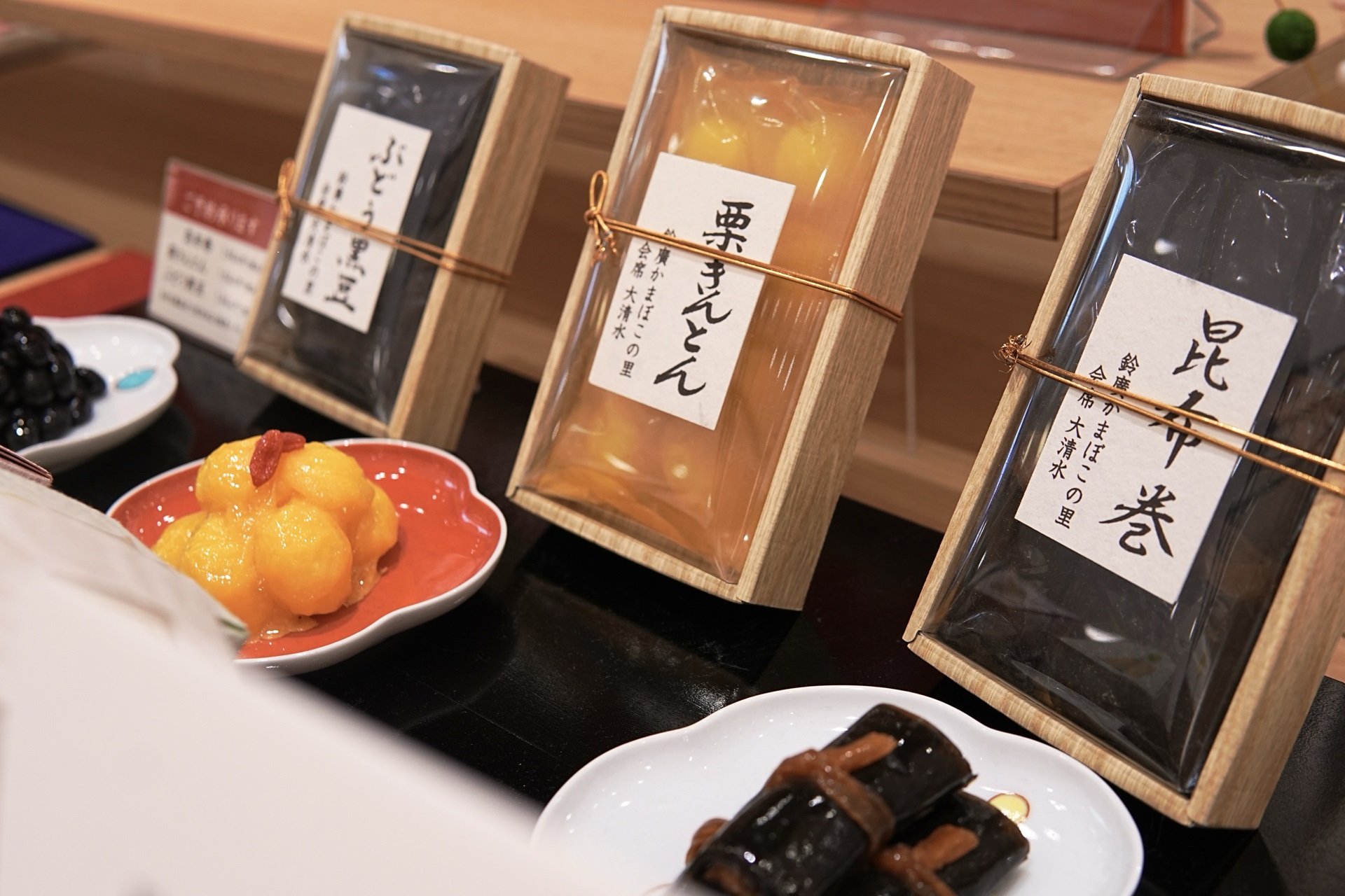 • 栗きんとん:大粒の栗を黄金色に。「お宝豊かに」と願う、新春の輝き。