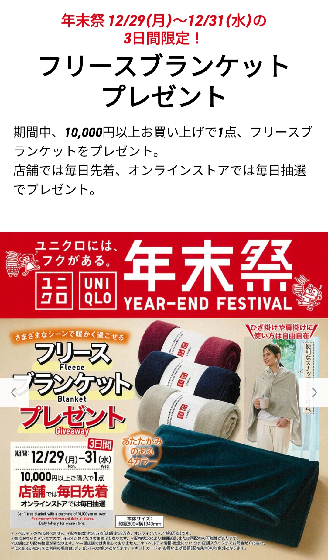 SHOP NEWS ユニクロ年末祭!! ユニクロ / ファッション WEST ANNEX / 2F 今年最後の感謝を込めて、 ユニクロ年末祭、只今開催中です! 冬物商品が年末特価でお買い得。 充実した年末年始を過ごせる商品が、年末特価で勢揃い! ユニクロ年末祭は12/31大晦日まで。 この機会にぜひお買い求めください!! ショップ情報を見る 前の記事 年末年始営業時間のお知らせ