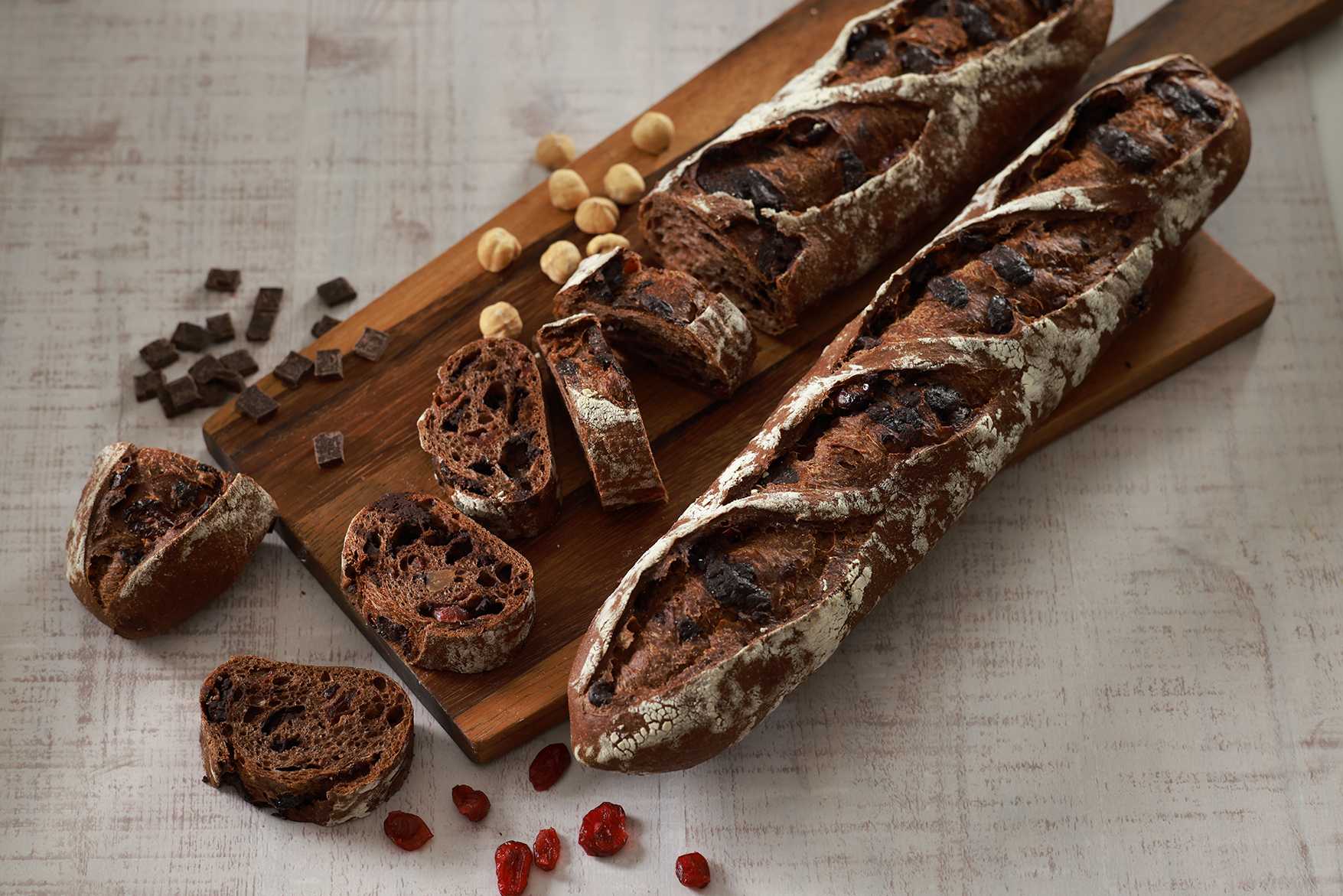 クーベルチュールチョコレートの入った、この時期限定のショコラ味のバゲットです。濃厚なチョコレートの味わいとアクセントに加えたクランベリーの酸味、ヘーゼルナッツの香ばしい食感が絶妙なこだわりの一品です。