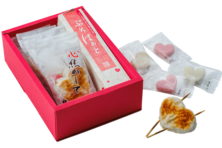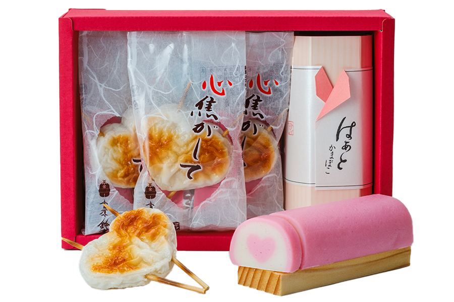 香ばしいハート型の焼き蒲鉾「心焦がして」や、切り口にハートが現れる「はぁとかまぼこ」を詰め合わせた、