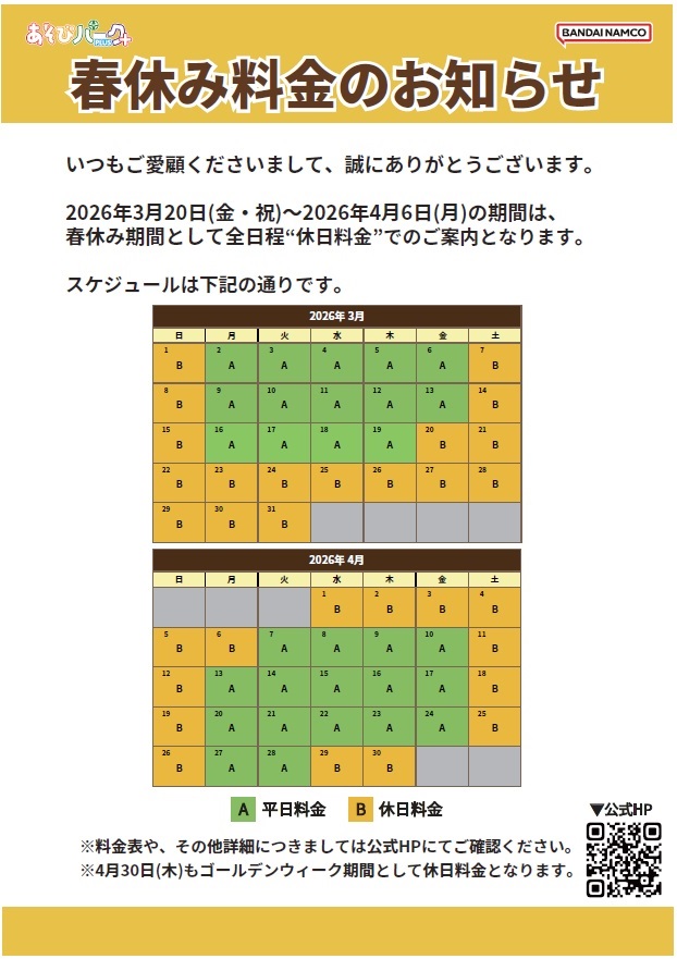 SHOP NEWS 春休み料金のお知らせ あそびパークPLUS / サービス・カルチャー・その他 WEST / 3F いつもご利用ありがとうございます。 あそびパーク小田原ダイナシティ店です。 下記画像の日程は春休み料金となります。 詳しくはQRから公式ホームページまたは ご不明な点がございましたら お気軽にお問い合わせください。 ☎0465-20-7765 ショップ情報を見る 前の記事 キャスター交換 次の記事 LINEお友達登録のご案内