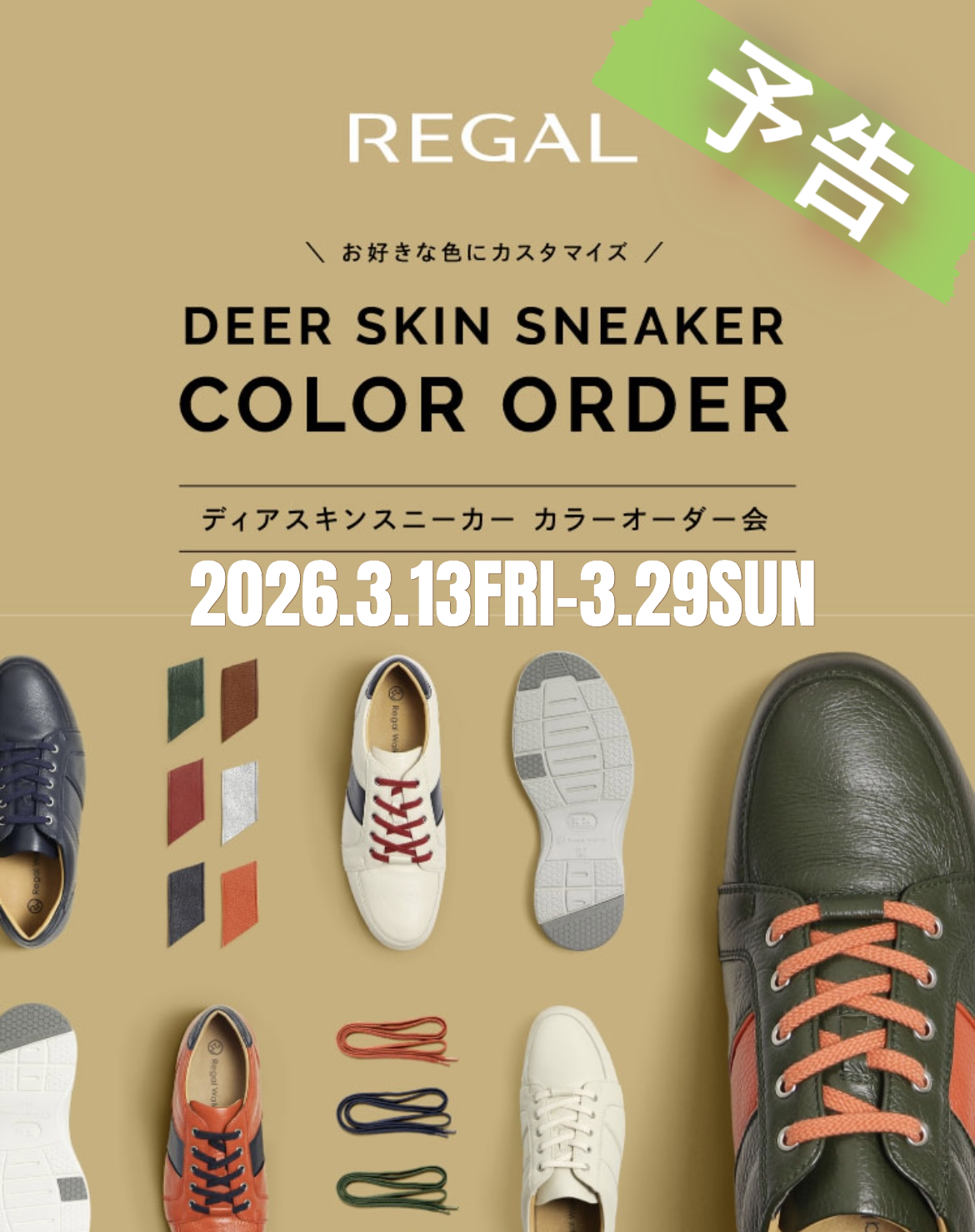 2026年3月13日(金)~29日(日)までの期間、REGAL SHOESにてお買い上げいただくと、リーガルメンバーズポイント「ポイント2倍」または、REGALオリジナルショルダーバッグ(ブラックorベージュ)のいずれかひとつをプレゼント✨