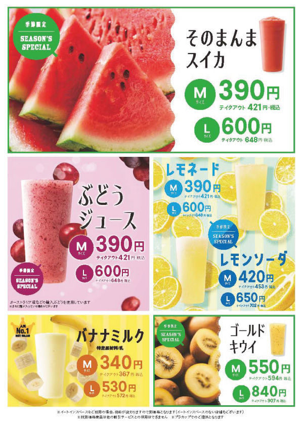 その他、期間限定のぶどうやレモンソーダ、レモネードの継続販売、通年メニューなど店舗にてご用意しております。