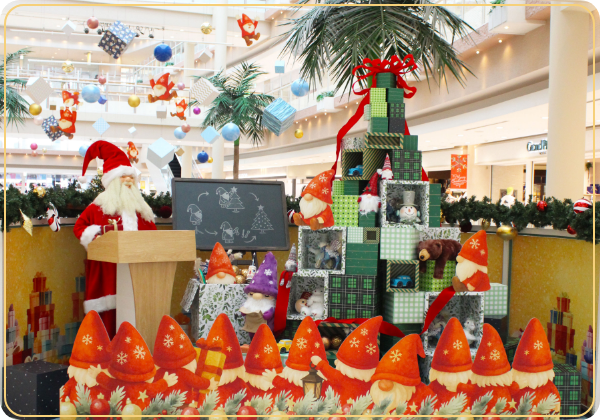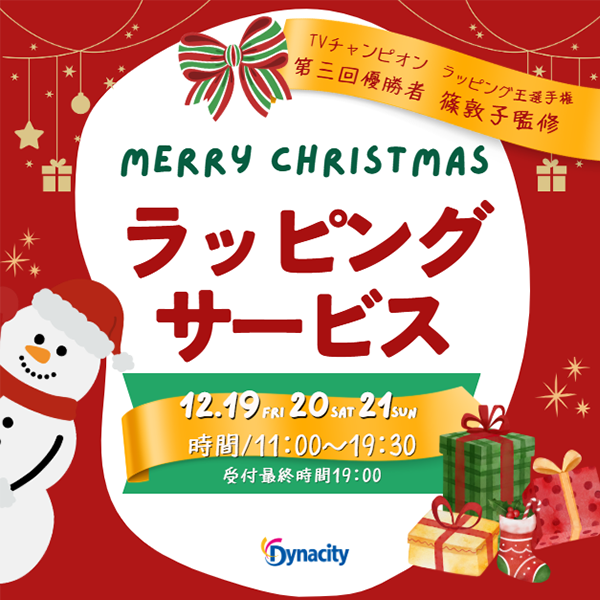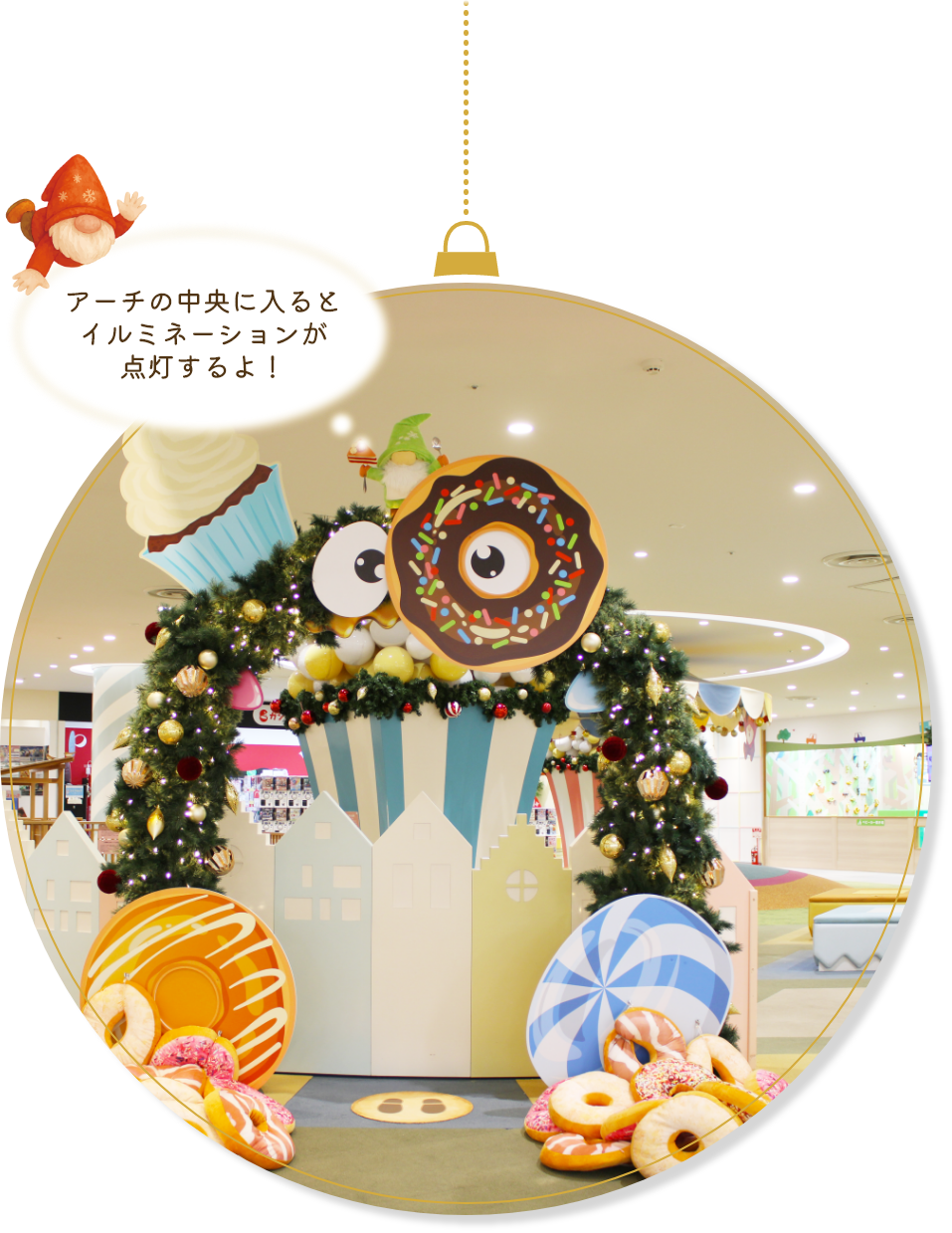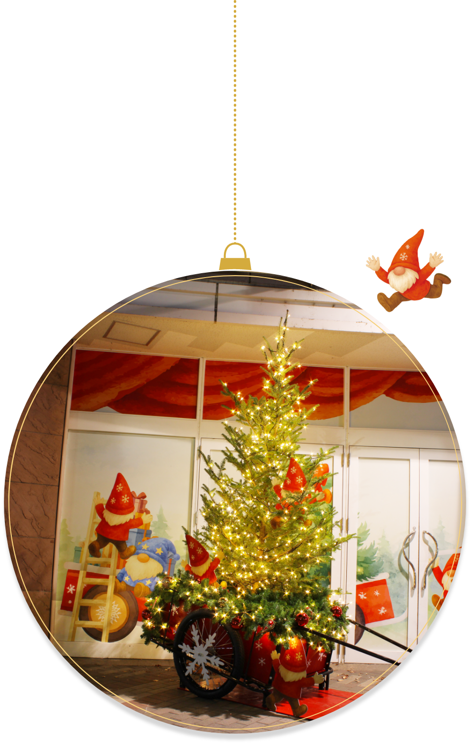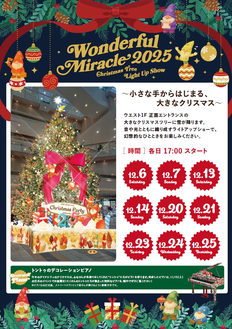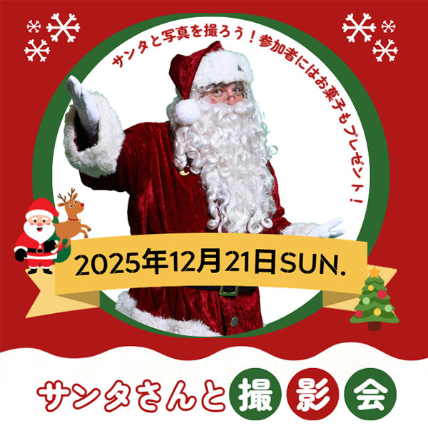 ダイナシティウエスト正面口の大きなクリスマスツリーのもとで、サンタクロースと一緒に記念撮影をしていただけます。参加者にはお菓子をプレゼント!