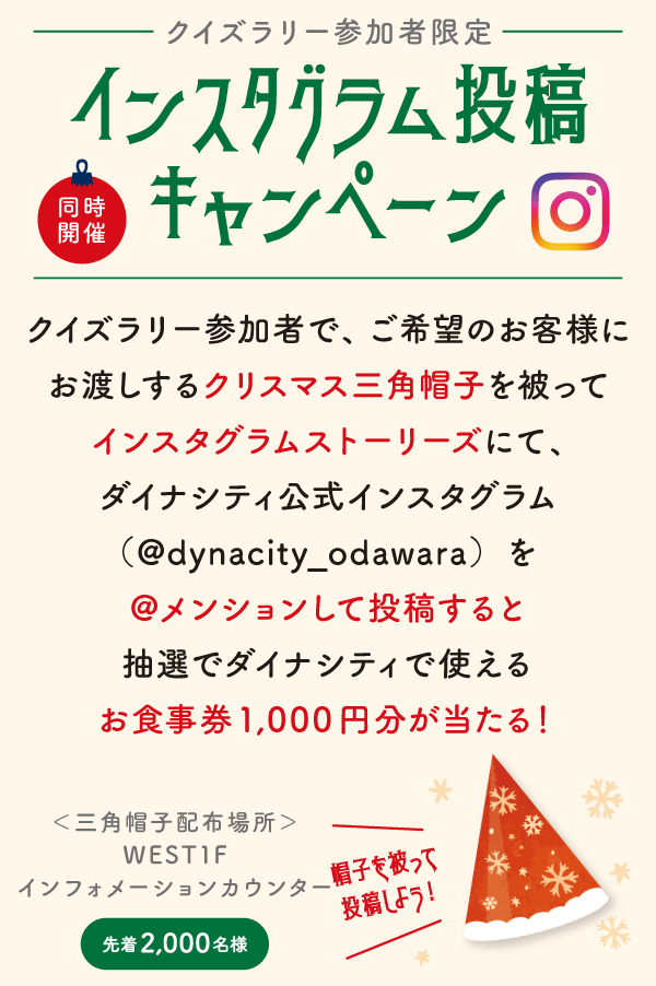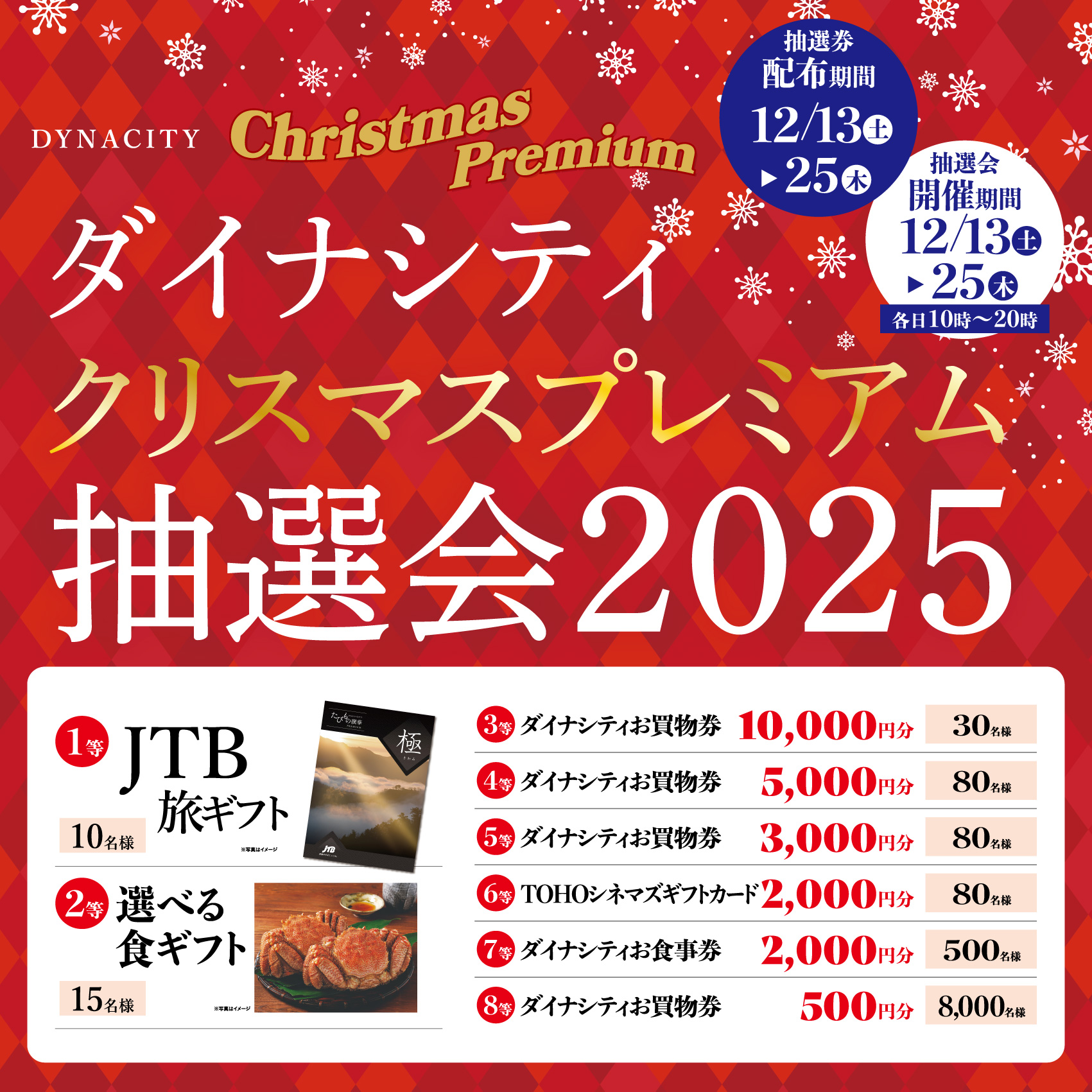 期間中、ダイナシティ専門店(対象外店舗有)でお買上げ5,000円(税込み)毎に抽選券1枚進呈。抽選券は1枚で1回、補助券は5枚で1回、抽選会にご参加いただけます。