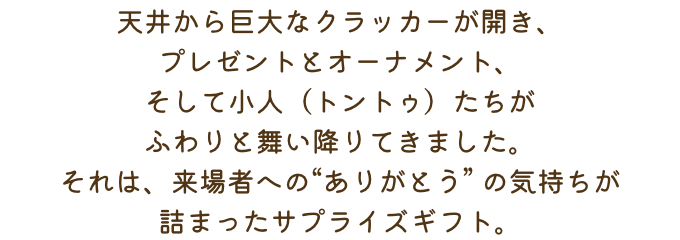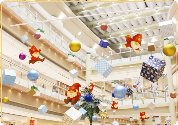 ウエスト1F 正面エントランスの大きなクリスマスツリーに雪が降ります。音や光とともに織り成すライトアップショーで、幻想的なひとときをお楽しみください。