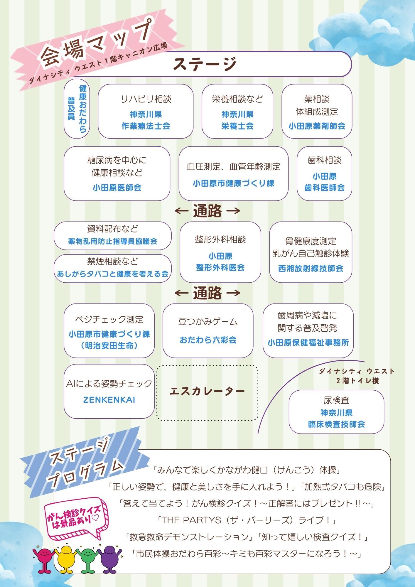 小田原医師会、小田原整形外科医会、小田原歯科医師会、小田原薬剤師会、神奈川県臨床検査技師会、神奈川県栄養士会、第5県民活動事業部、神奈川県作業療法士会、西湘放射線技師会、株式会社三和化学研究所、薬物乱用防止指導員協議会、あしがらタバコと健康を考える会、小田原市食育サポートメイト、おだわら六彩会、ZENKENKAI小田原支部、明治安田生命保険相互会社、小田原東営業所、健康おだわら普及員、THE PARTYS(ザ・パーリーズ)、小田原保健福祉事務所、小田原消防署、小田原市健康づくり課