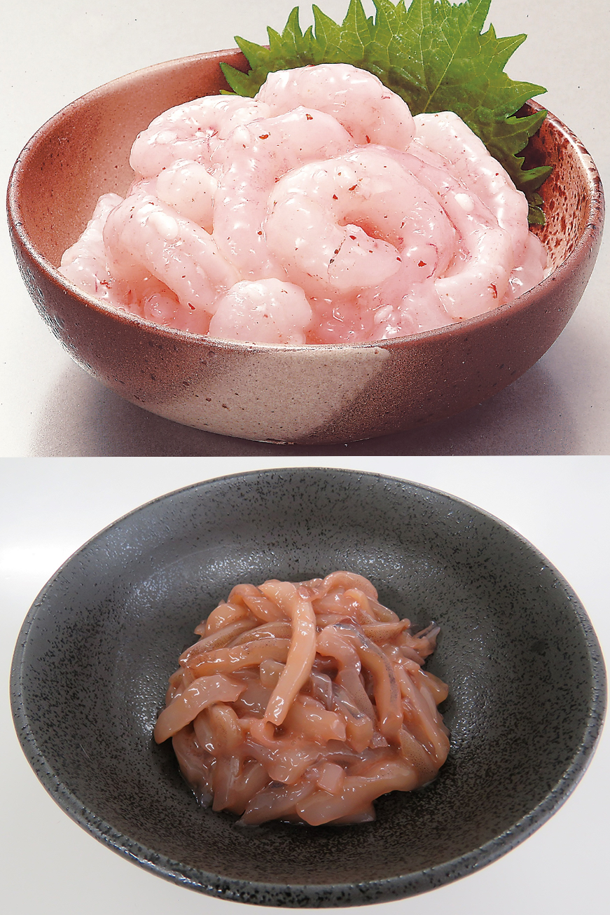 紋甲いかに、昆布・トビ卵を合わせたお刺身風珍味です。