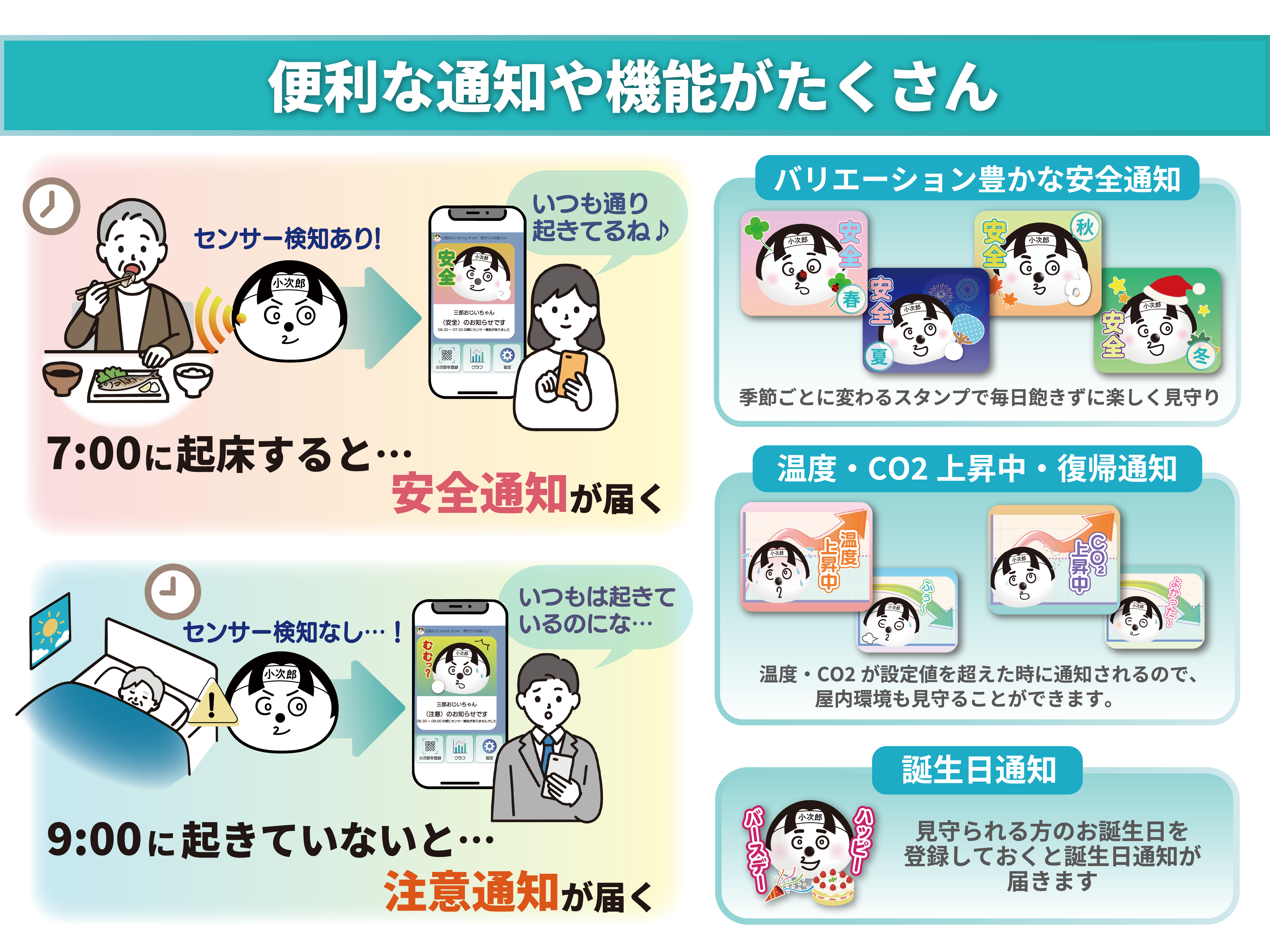 小次郎くんが一人暮らしの高齢者を優しく見守り、Wi-Fi環境が無くても異変があればLINEやメールでご家族や関係者にアラート通知でお知らせします。