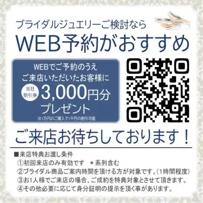 結婚指輪や婚約指輪をお探しの方はQRコード、または下の「ブライダルジュエリーWEB予約」からアクセスしていただき、当店をお選びのうえ必要事項をご入力ください。