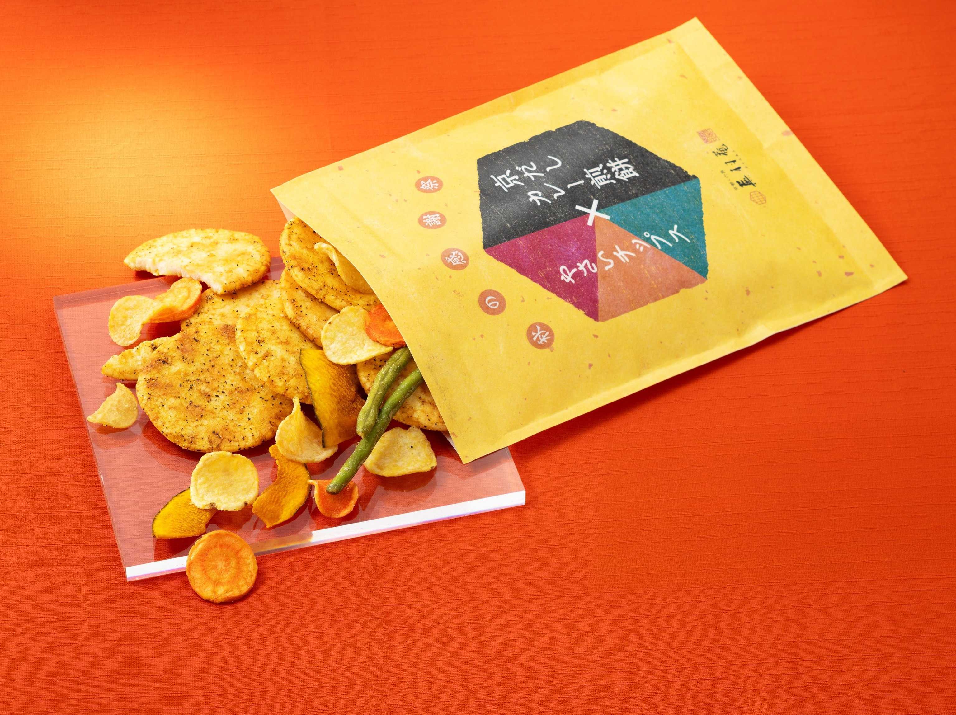 ◆京だしカレー煎餅&野菜チップス 毎年夏の限定でご愛顧いただいております「京だしカレー煎餅」に、特殊製法で素材をそのまま生かした野菜チップスを加えました。よりカレーらしさを追求した一品です。 165g入り 税込897円
