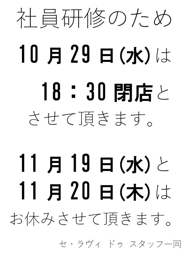 SHOP NEWS 閉店時間変更 連休のお知らせ セ・ラヴィ・ドゥー / サービス・カルチャー・その他 EAST / 1F 社員研修のため 10月29日(水)は18:30閉店とさせて頂きます。 11月19日(水)・11月20日(木)は 連休させて頂きます。 ショップ情報を見る 前の記事 ふんわり濃厚マロンホットケーキ 次の記事 元祖どないやたこ焼