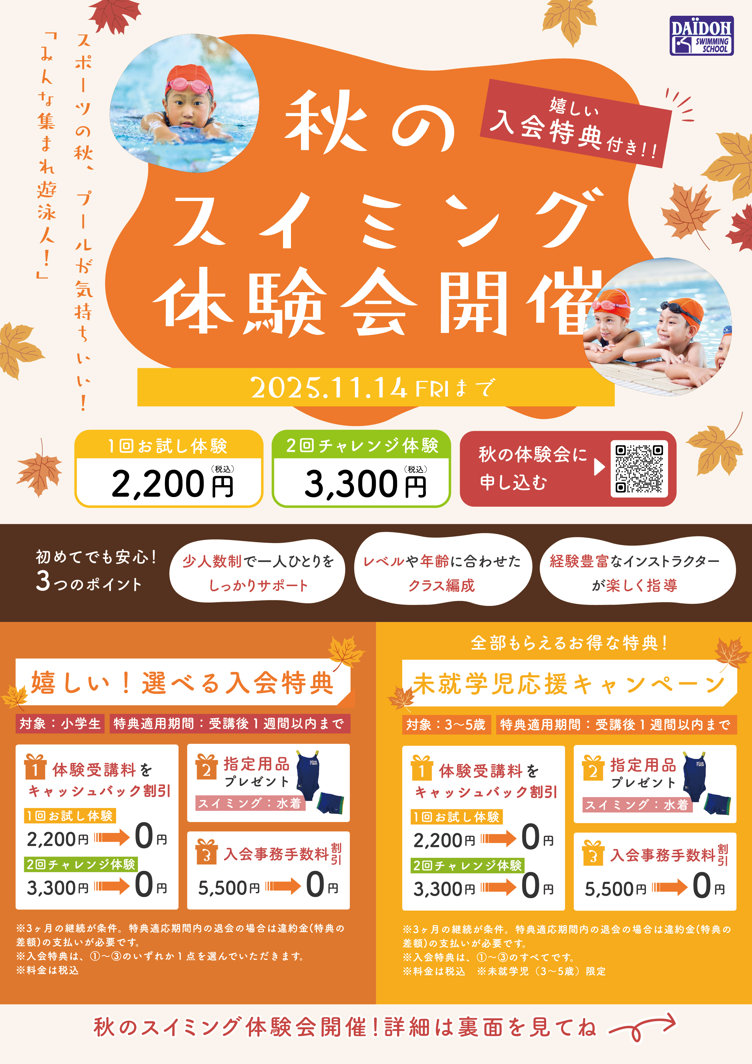 SHOP NEWS ジュニアスイミング 秋の体験会開催 ダイドースポーツ / サービス・カルチャー・その他 WALK / CINE WALK 1F こんにちは!涼しくなり過ごしやすくなってきましたね。ダイドースポーツクラブではジュニアスイミング秋の体験会を開催しております。1回体験又は2回体験とお子様の状況に合わせてお選びいただけます。またご参加いただきご入会いただいた場合は大変お得な入会特典もご準備しております。 ぜひご兄弟やお友達と一緒にご参加くださいませ。皆様お待ちしております。 秋の体験会申込ページ ショップ情報を見る 前の記事 美easy series / New Collection WOOLISHTWILL 次の記事 10月はピンクリボン月間