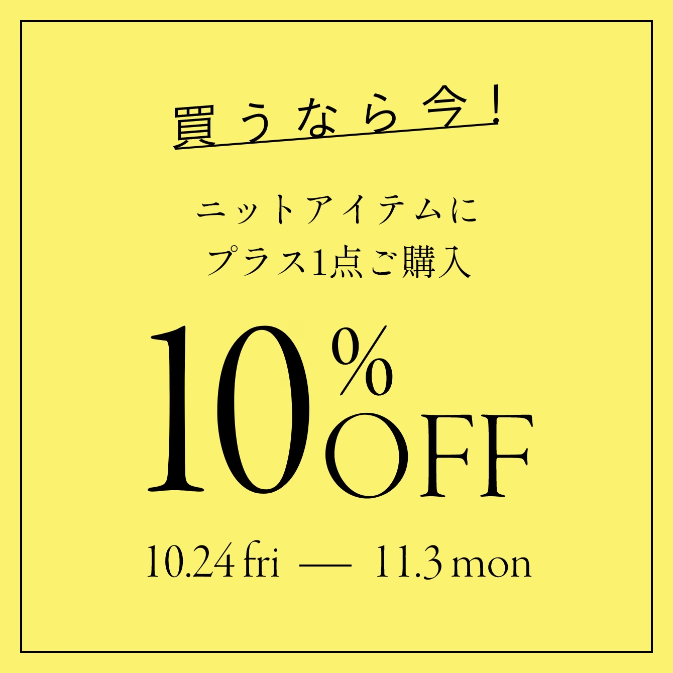 期間中ニット商品プラス1点のご購入で10%オフとなるお得なキャンペーンです。是非この機会にご来店下さい!