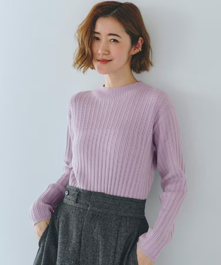 胸元でリブ編みとミニケーブルが切り替わるデザインで、華やかな印象のアイテムです。
