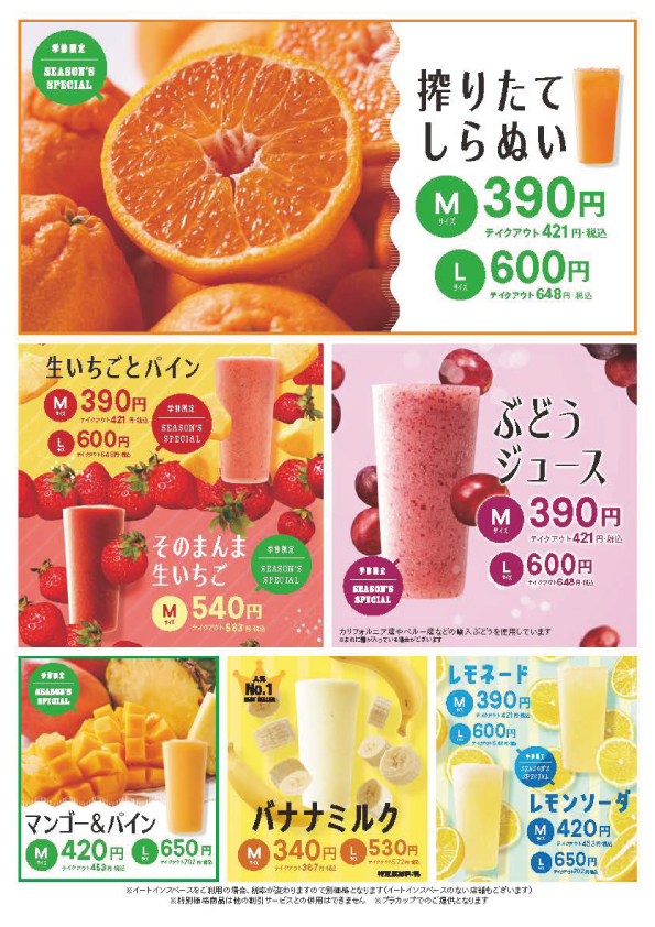 その他、期間限定のそのまんま生いちごやレモネード、レモンソーダの継続販売、通年メニューなど店舗にてご用意しております。