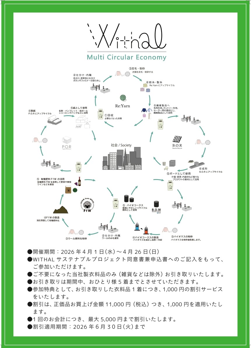 回収されたお洋服は糸や紙、燃料へリサイクルされ新しい資源として活用。 大切にしていただいたお洋服が「サーキュラー=循環」し、再び生まれ変わる取り組みにご参加いただけます。